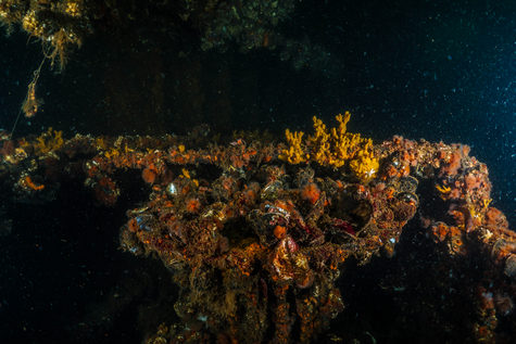 | Ohrenqualle an den Aufbauten | Wrackteil schön bewachsen |