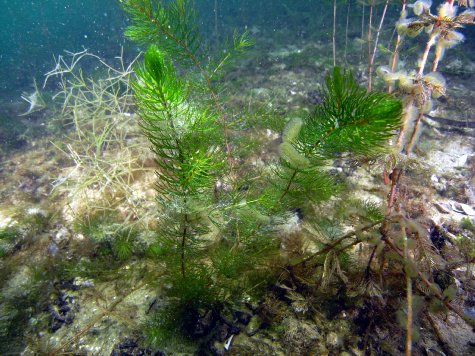 | Ähriges Tausendblatt ( Myriophyllum spicatum ) | Rauhes Hornblatt ( Ceratophyllum demersum ) |